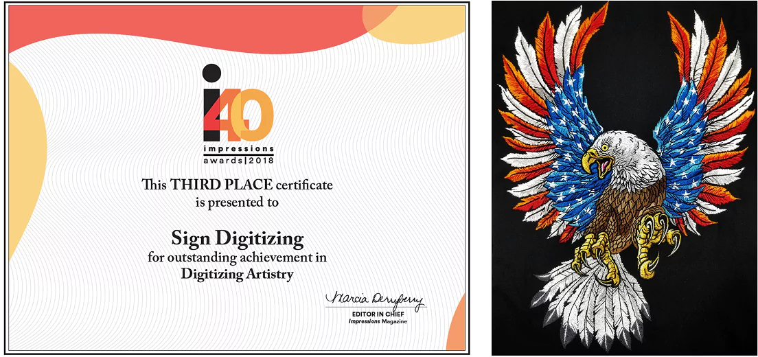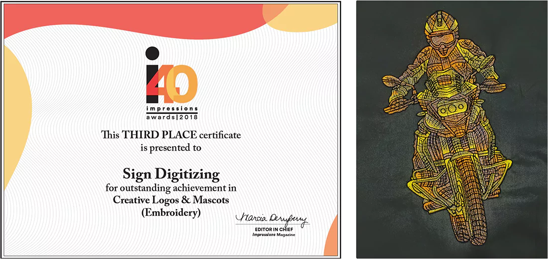At Sign Digitizing, excellence is not just a promise - it’s proven. Over the past 20 years, our passion for creativity and precision has earned us 10 prestigious international awards in embroidery digitizing and design, proudly recognized by Stitches and Impressions magazines.